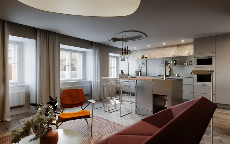 VII. DŮM nabízí jedinečné rekonstruované byty s nádhernými výhledy - od menších po velkoryse řešené byty ve vyšších patrech a unikátní podkrovní byt s výhledy do všech světových stran.