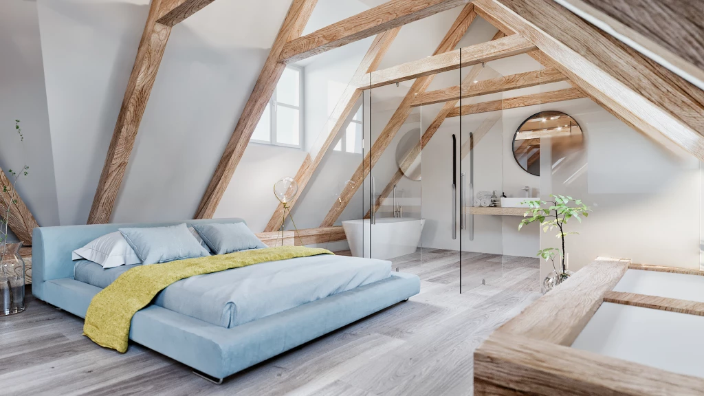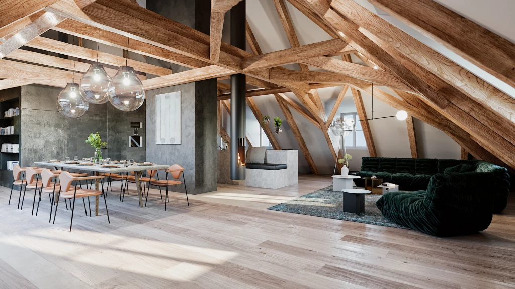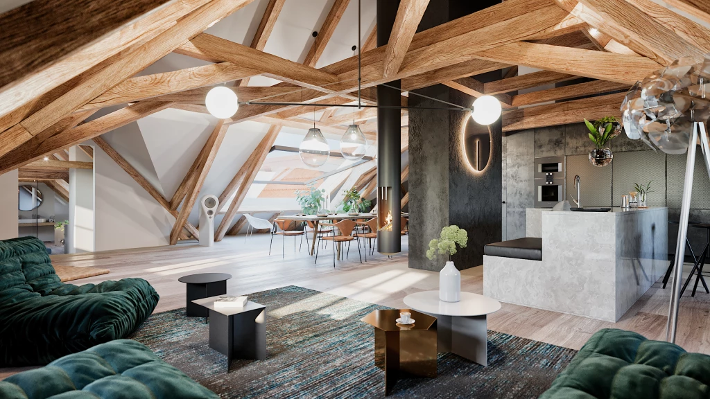 Unikátní podkroví se soukromým vstupem z výtahu nabízí velkorysý prostor s výhledy na všechny světové strany.